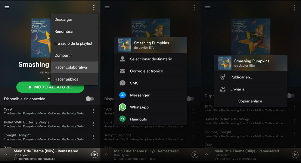 Si se ha convertido en una de la aplicación de streaming más popular no es solo por haber sido en una de las primeras en llegar, también por haber sabido leer bien las necesidades sociales de su público, y hace tiempo que permite ya la creación de listas colaborativas. Para ello basta con ir a la lista que quieras y pulsar sobre los tres puntos del menú, y a continuación, sobre «hacer colaborativa«, y a continuación enviar el enlace a tu amigo. A partir de ese momento, este podrá realizar cambios, o mandar el enlace a otra persona (que también podrá realizar cambios).