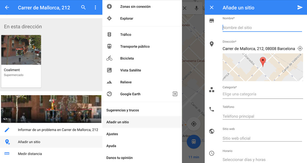 Ahora desde da aplicación de Google Maps para Android puedes añadir un lugar nuevo. Es tan sencillo como seleccionar el punto en el que lo quieres poner y luego desplegar el menú inferior y pulsar sobre «añadir lugar nuevo». Podrás añadir el nombre, la categoría, los horarios así como fotografías, teléfono y web.