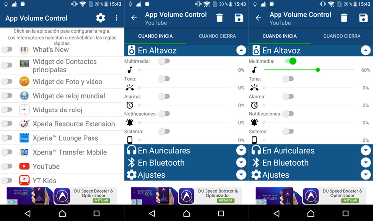 Ahora ya podemos empezar a trastear en la aplicación. Si quisiéramos -por ejemplo- ajustar el volumen de la aplicación de YouTube, el procedimiento a seguir sería el siguiente: