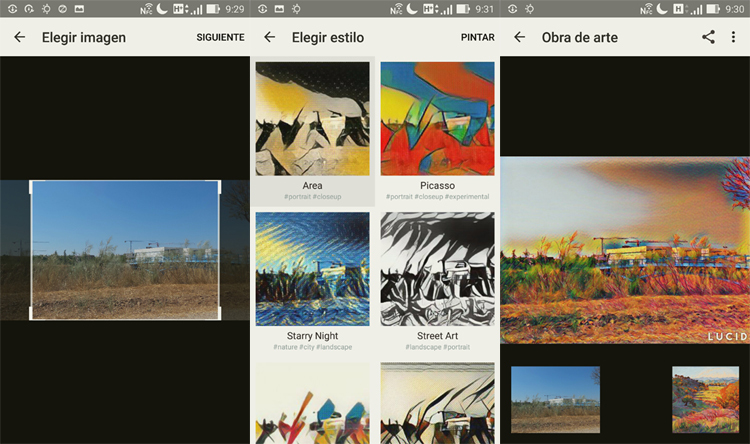 Lucid funciona de una forma muy sencilla, y tan solamente requiere que seleccionemos una imagen de la galería de nuestro móvil para después poder elegir entre los diferentes filtros artísticos disponibles en la aplicación. Por lo que he podido comprobar, en la aplicación encontramos 16 filtros artísticos diferentes (frente a los 30 de Prisma) que, en mayor o menor medida dependiendo del que elijamos, dan un acabado muy original a nuestras fotografías.
