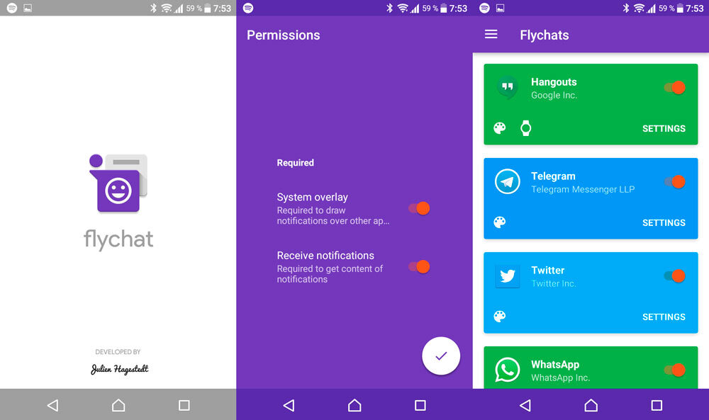 Sencilla y lista en muy pocos pasos: una vez descargada FlyChat tendrás acceso a las notificaciones en burbuja. De momento son compatibles Hangouts, WhatsApp, Telegram, Twitter, Skype, Line, Facebook Messenger… y algunas más. FlyChat detecta en el inicio qué apps de mensajería tienes instaladas, por lo que no te molestará con configuraciones ajenas.
