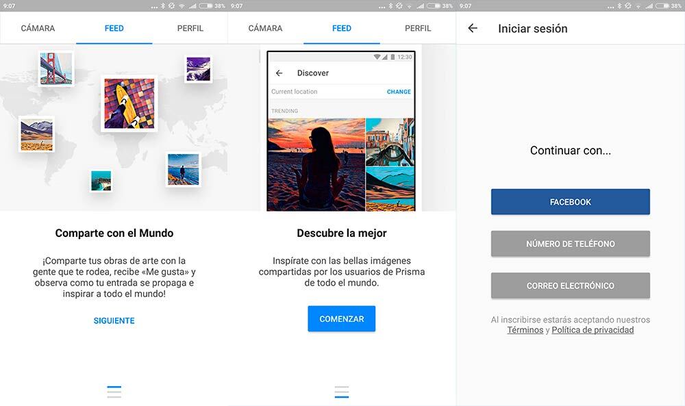 La edición de imágenes con la gran cantidad de filtros artísticos incluidos sigue invariable: continuarás modificando tus fotos igual que antes. Eso sí: ahora te aparecerá el icono de un triángulo azul cuando vayas a compartir el resultado. Pulsando sobre el triángulo accederás a una ventana de publicación con la posibilidad de añadir un pie de foto a tu imagen editada por Prisma. Una vez compartida aparecerá en el feed de tus seguidores.