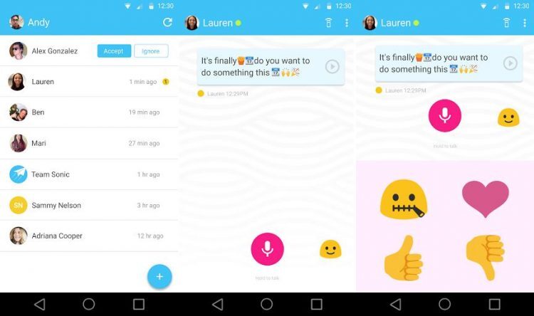 El enfoque que sigue esta aplicación de mensajería es que no tenemos teclado, sino que solo podemos mandar mensajes de voz. Al mandar mensajes de voz estos son transcritos a modo texto, en el que la propia aplicación añade emojis al texto.