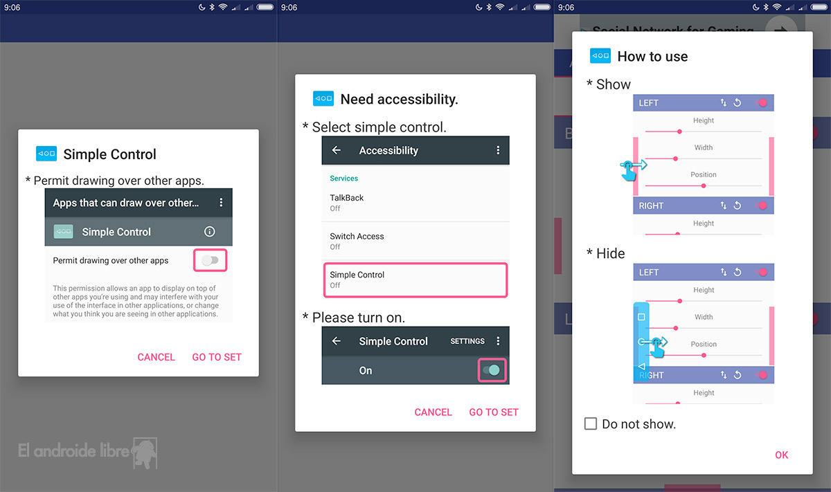 Cuando la instalamos nos pedirá permisos para poder ser usada encima de otras aplicaciones, algo lógico ya que se mostrará sobre la que tengamos abierta. Eso será un inconveniente si tenemos un dock en el launcher por ejemplo aunque de ser así podríamos ponerla en un lateral o incluso arriba.