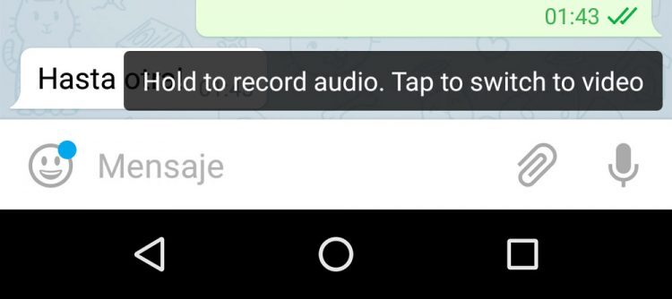 Al principio, parecerá que nada ha cambiado en nuestra aplicación de Telegram. Y eso es porque la función se encuentra «escondida». Tenemos que pulsar una sola vez sobre el micrófono para cambiar de audio a vídeo, y viceversa. Grabar y enviar el mensaje se seguirá haciendo manteniendo pulsado el botón.