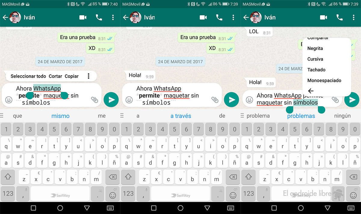 La última actualización de WhatsApp permite poner de forma sencilla las palabras en negrita, cursiva o tachado simplemente eligiendo la opción.