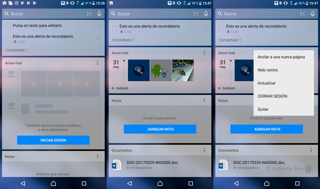 Esta nueva función une a los móviles Android con cualquier otro dispositivo que tenga un navegador web. Una vez tengas instalado Arrow Launcher basta con que te desplaces a la zona de las tarjteas, la que se encuentra a la izquierda de los escritorios. Allí encontrarás Arrow Hub: una pequeña ventana que te mostrará los distintos archivos intercambiados con la posibilidad de subir nuevos.