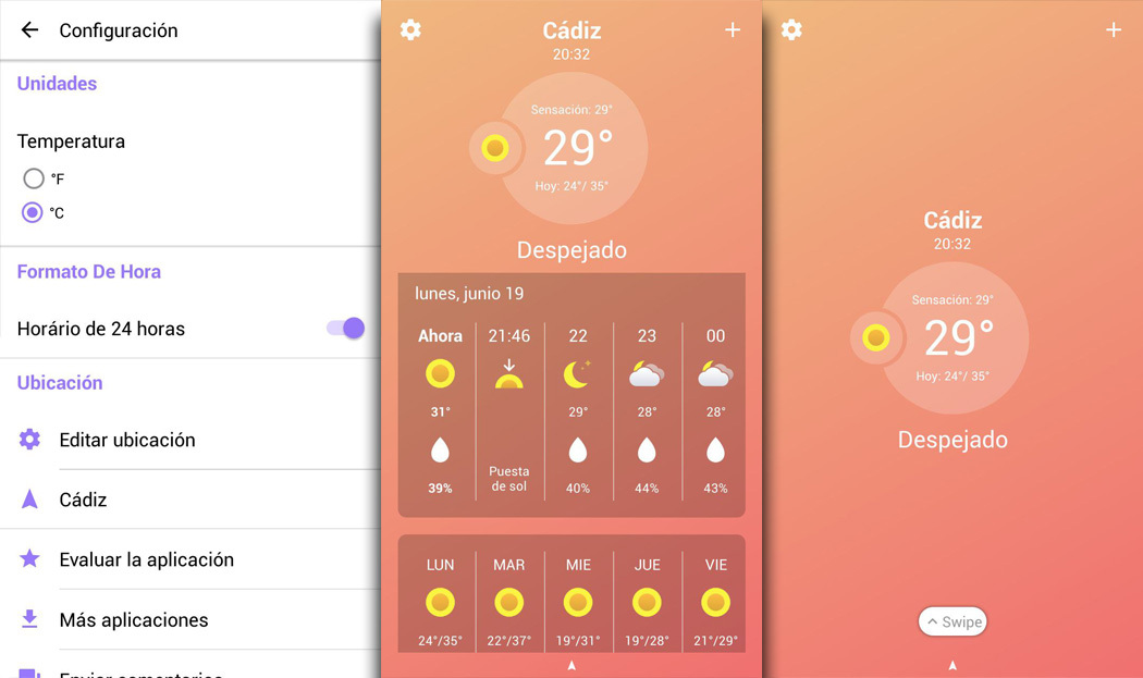 Como vemos nos ofrece datos bastante completos. Volviendo a lo visual, tenemos una interfaz que irá adaptándose a las condiciones atmosféricas. En condiciones de baja temperatura, tendremos un entorno oscuro, que irá aclarándose a medida que la temperatura vaya en aumento.