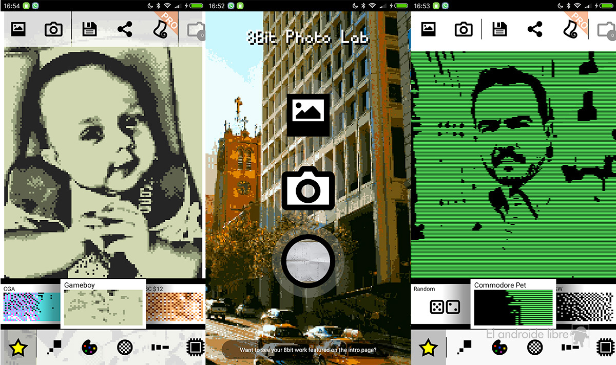 Se llama 8Bit Photo Lab y permite hacer fotografías con la cámara del móvil o importarlas desde la galería para aplicarle una serie de filtros que modifiquen su apariencia para obtener imágenes de 8 bits.