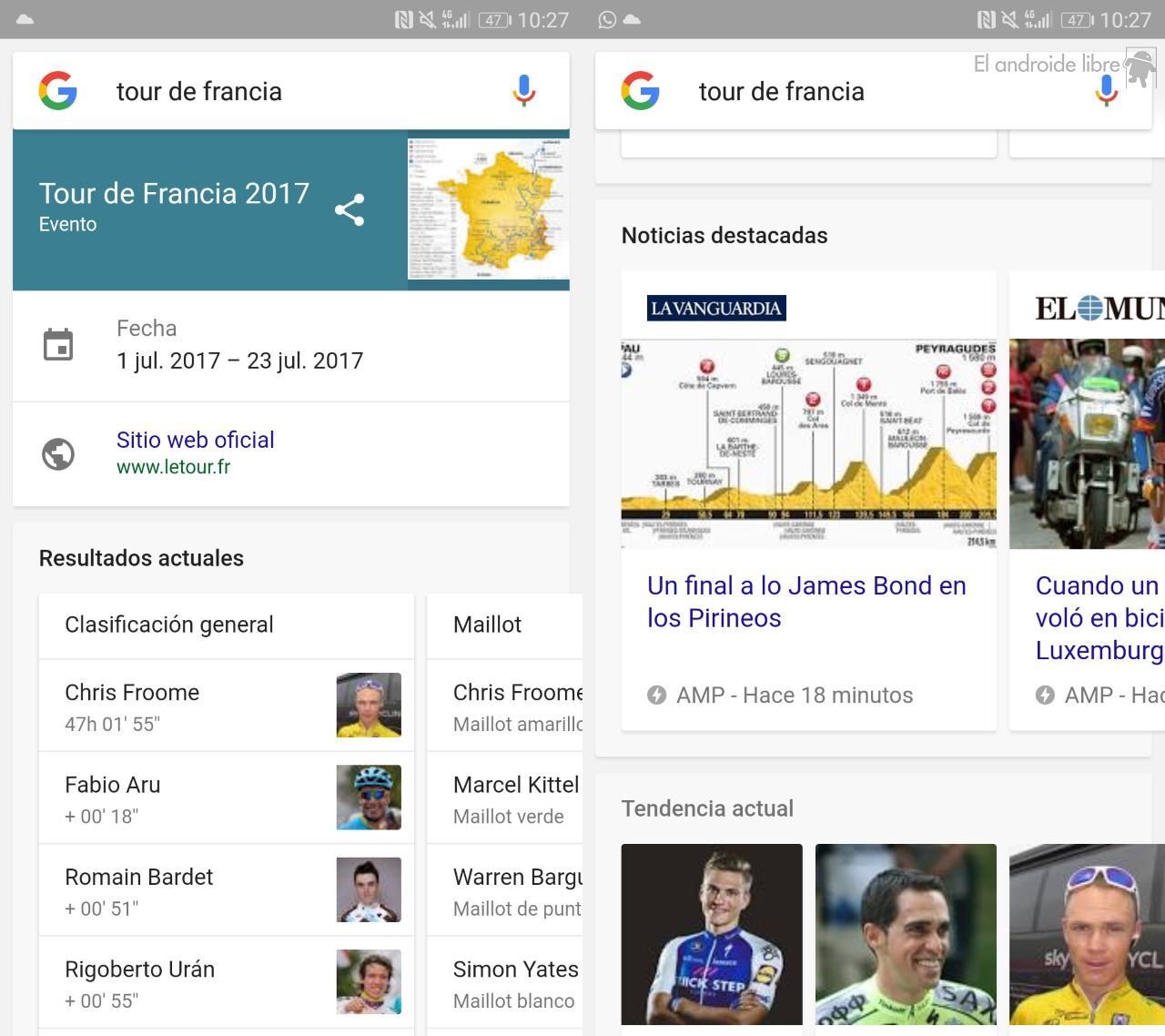 La aplicación de Google destaca por ser un buscador cada vez más completo. En su última actualización han añadido una interesante característica. Si decidimos buscar información del Tour de Francia, la aplicación nos mostrará información interesante sobre la que para muchos es la mejor competición de ciclismo (y para otros, el sonido de fondo de la siesta oficial de verano).