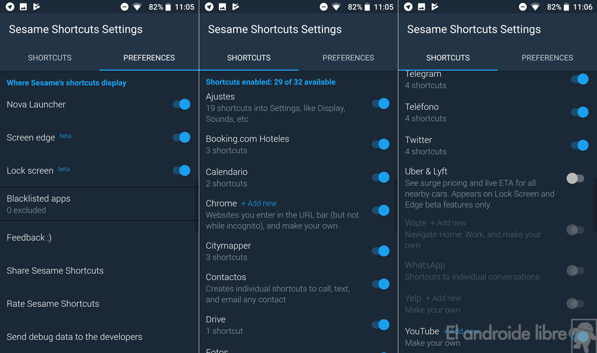 La gran novedad es que ahora Nova Launcher beta tiene integración con un nuevo complemento, Sesame Shortcuts. Esta aplicación escanea todo nuestro teléfono y se integra con varias aplicaciones para proporcionar accesos directos a sus funciones. Por ejemplo, accesos directos a álbumes en Spotify, mostrar información de Uber en la pantalla de bloqueo o conversaciones de WhatsApp.