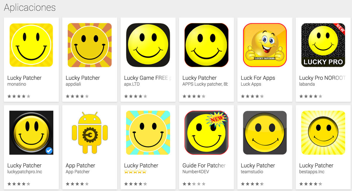 No busques a Lucky Patcher en la Google Play Store porque no lo vas a encontrar: es una aplicación que se descarga en forma de Apk. Si buscas justo por ese nombre, Lucky Patcher, te aparecerán decenas de aplicaciones que imitan el logo de la app original (un emoticono sonriente amarillo) escondiéndose detrás de su fama. Suelen tener buena puntuación a pesar de que no hacen lo que prometen y llegan a acumular hasta casi el millón de descargas. Solo por imitar el aspecto de una app conocida.