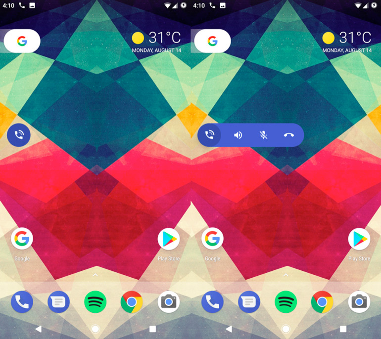 Un toque lo abre en horizontal, y nos da a elegir tres opciones a desactivar y activar: altavoz, silenciar micrófono y colgar llamada. De esa forma podemos controlar la llamada aún estando usando otras aplicaciones, y sin necesidad de usar una notificación extendida.