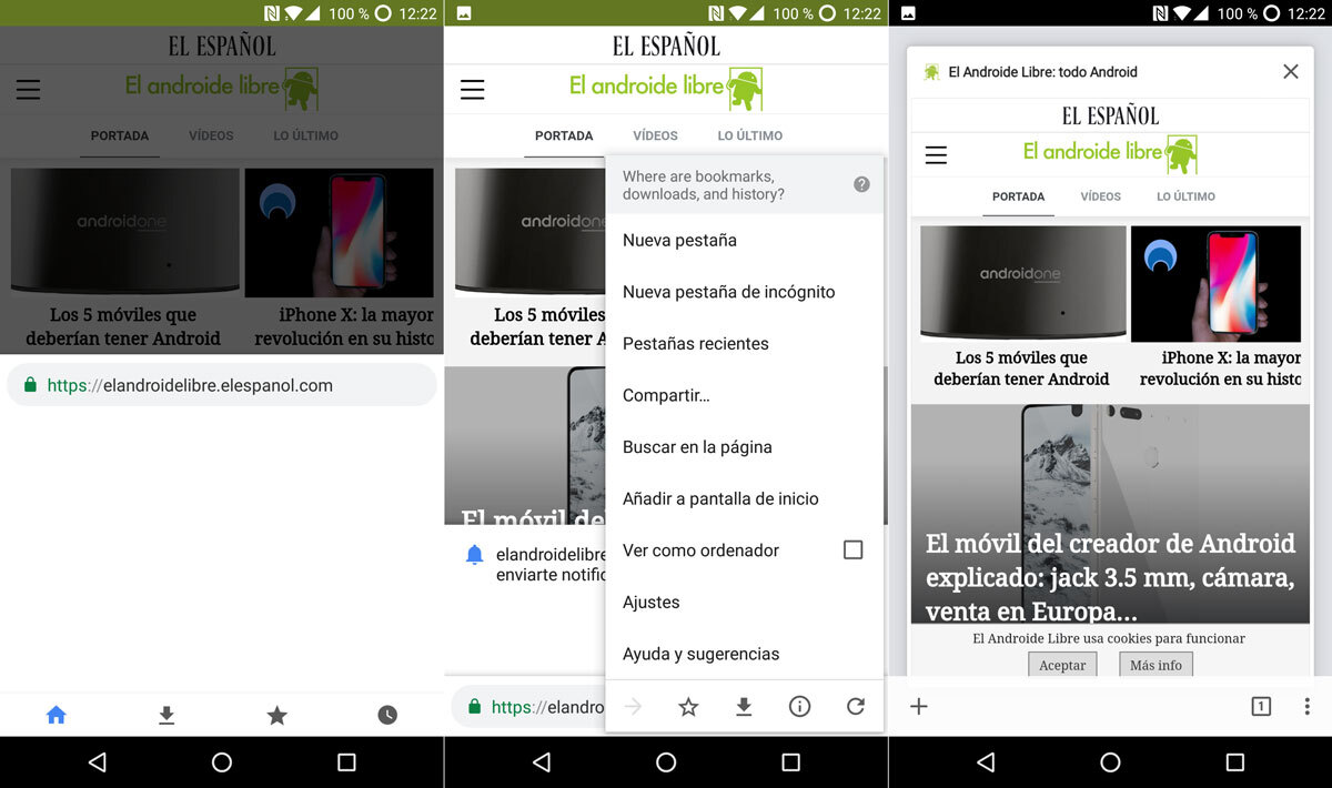 El gestor de pestañas también adquiere un fondo translúcido, y se han eliminado enlaces duplicados en los menús. Ahora los usuarios tendrán que tirar de esta barra inferior para acceder a las descargas, favoritos e historial.