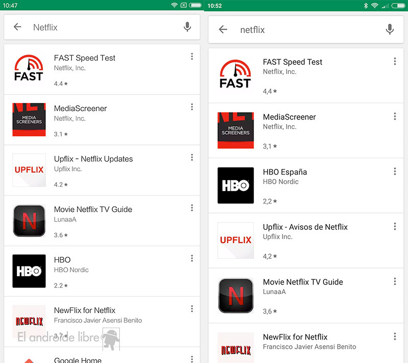 Ante las dudas hemos realizado un experimento. Hemos hecho la búsqueda en dos móviles de Xiaomi, una de las marcas más afectadas por la decisión. En las capturas de este artículo tenéis el comportamiento de un Xiaomi Mi Note 3 con Android 7.1 Nougat y ROM china en la zona izquierda y el de un Xiaomi Redmi Note 4x con Android 6.0 Marshmallow y ROM Global en la zona derecha.