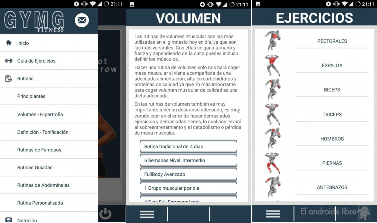 Encontraremos tres apartados básicos: Guía de ejercicios, rutinas y nutrición. En las guías de ejercicios encontraremos una lista con todos los grupos musculares, si pinchamos en unos de ellos, podremos ver todos los ejercicios con los que trabajarlo.