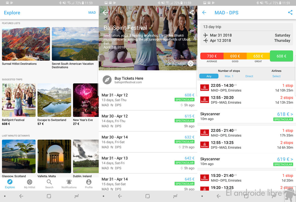 Hitlist es una aplicación que quiere ayudarnos a encontrar los mejores vuelos. Para ello analiza los destinos uno a uno, buscando los vuelos disponibles desde nuestro aeropuerto más cercano. Una vez tiene los precios, los clasifica según lo buena que sea la oferta. Cuenta con un historial que comprueba si cada precio es bueno, y si es recomendable o no.