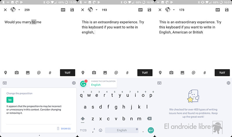 Además de la ortografía este teclado es capaz de corregir nuestra gramática, sugiriendo la eliminación de preposiciones, la inclusión de elementos o cambios en el vocabulario. Además sabe cómo hemos de puntual un texto, algo que en los últimos tiempos no se hace como se debería.