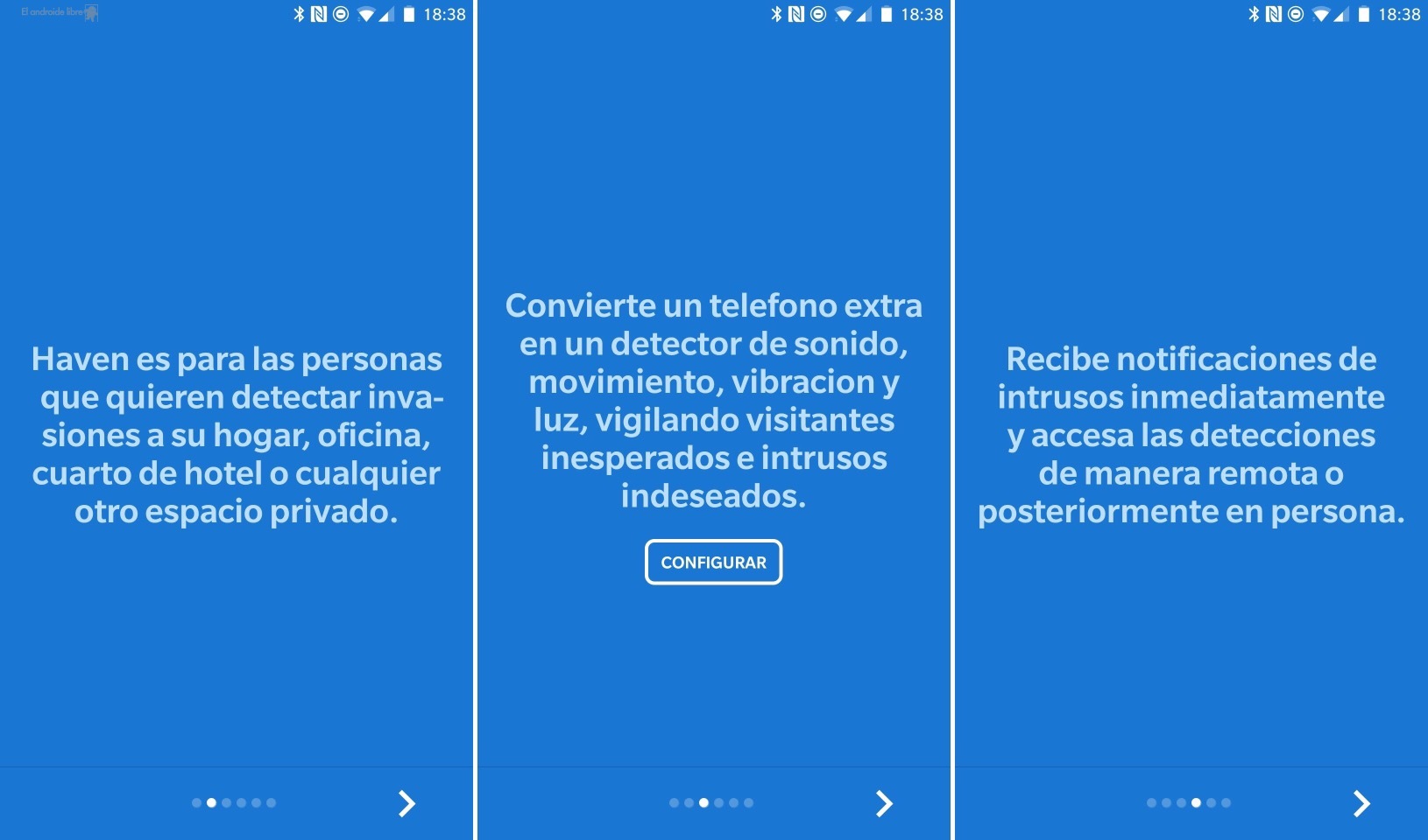 Haven usa tres elementos que prácticamente tienen todos los móviles actuales para vigilar nuestra casa cuando nosotros no estamos. Hablamos de la cámara de fotos, el micrófono y el acelerómetro. Una vez iniciemos la aplicación, tendremos que colocar nuestro móvil en su «puesto de vigilancia» y realizar un análisis de movimiento, ruido e imagen.