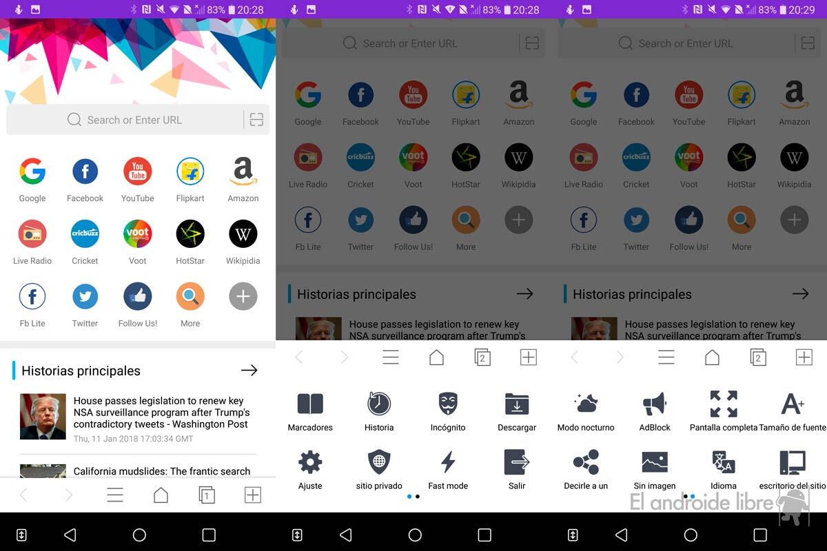 Barra de direcciones superior, control de navegación en la parte de abajo con el selector de pestañas y de opciones, ajustes para bloquear anuncios o activar la descarga solo de texto, permite ahorrar en datos móviles, incluye el ajuste del tamaño de texto, pantalla completa… Los desarrolladores han acertado de pleno, también en el diseño: Yo Browser se ve pulido y con los botones bien colocados.