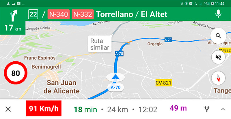 Una de ellas en concreto, la de velocidad actual, se pone en rojo si superamos la velocidad límite de la vía por la que vamos. Esa limitación la toma de OpenStreet Maps e incluye la mayoría de carreteras aunque no todas.
