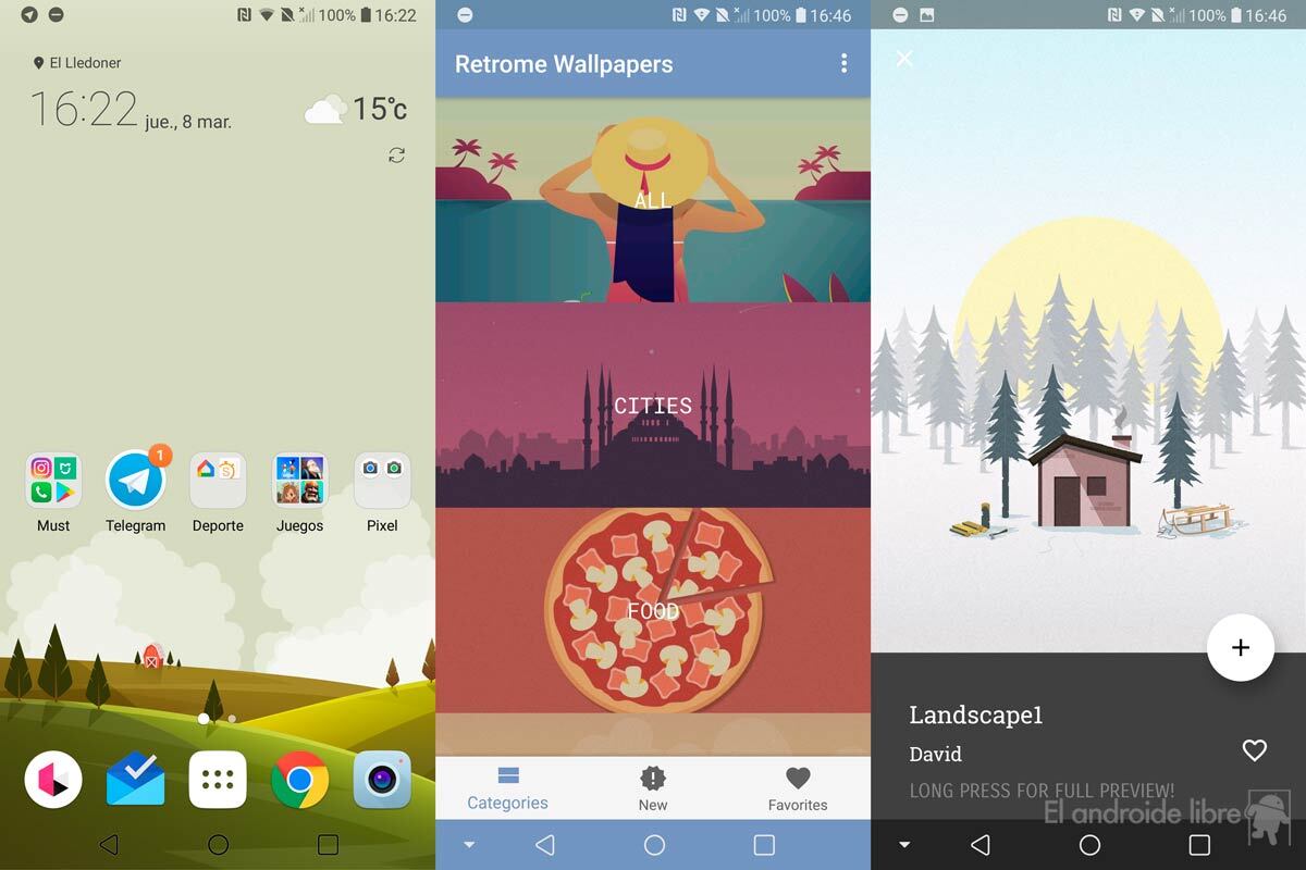 Lo que importa, que son los fondos, es que sean de calidad, originales y distintivos. Retrome cumple a la perfección las tres premisas sin alejarse en exceso del diseño Material Design. Hay wallpapers para todos los gustos y estilos, aunque echo en falta más color en las propuestas: las tonalidades suelen ser ocres y ligeramente apagadas. Alguna pega había que ponerle; además de que quizá peque de falta de actualizaciones.