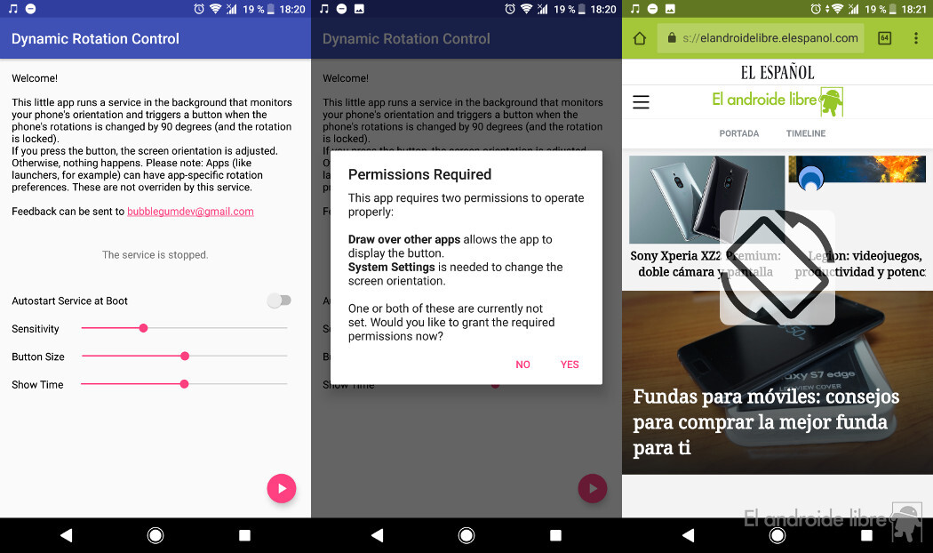 La app no tiene misterio: le das los permisos para modificar ajustes del sistema y en cuanto gires tu teléfono, aparecerá un icono de rotación en tu pantalla. Si lo tocas, la pantalla se girará automáticamente sin tener la opción activada por defecto. La app es gratis y no tiene publicidad.