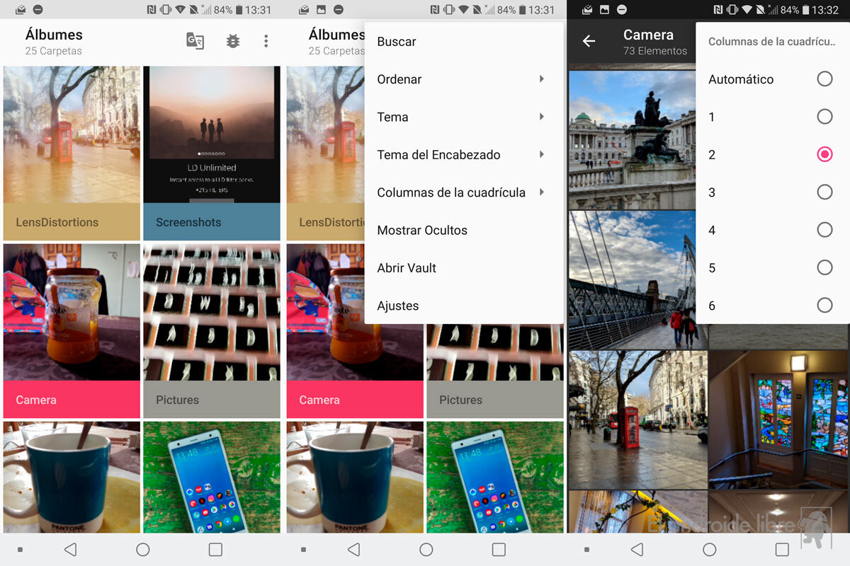 Podremos organizar el número de columnas, elegir entre varios estilos de interfaz con un modo noche incluido, existe la posibilidad de excluir carpetas de todo el mosaico… Y hasta podremos bloquear las imágenes para que nadie más las vea. Con código y hasta con la huella si el móvil tiene lector de seguridad.