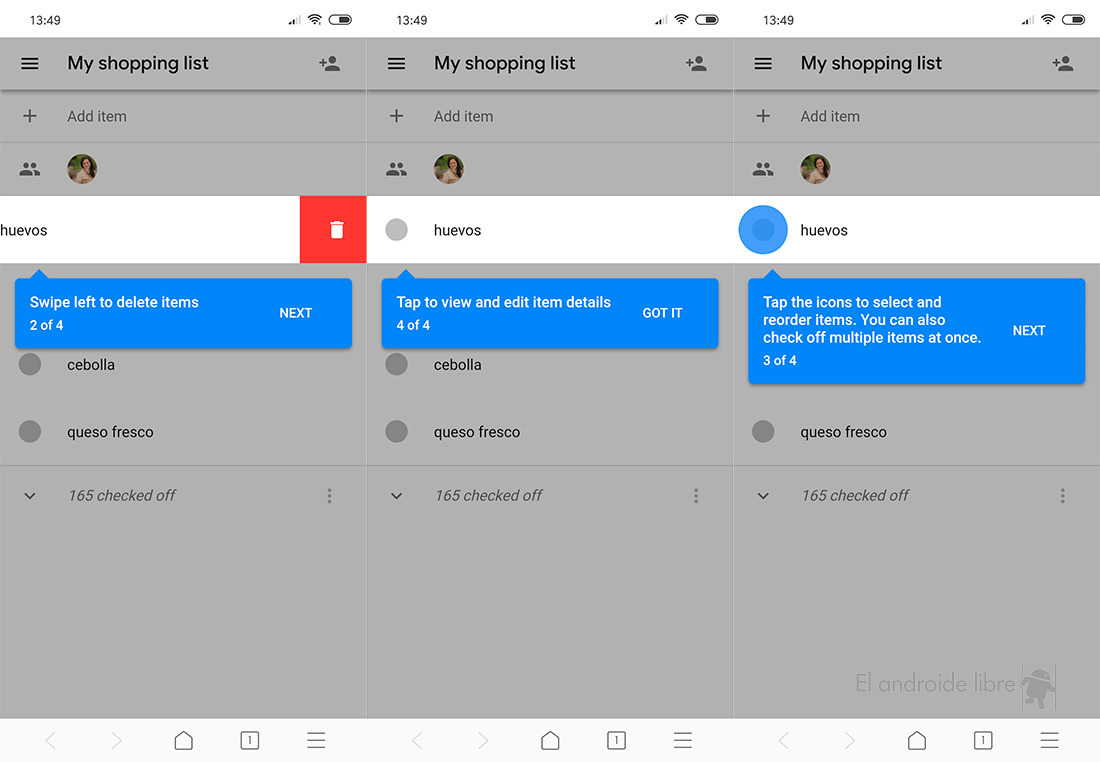 3. Deslizar a la izquierda: marcaremos el elemento como comprado.