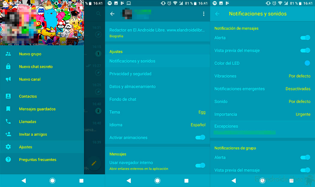 El primer apartado en el que vemos cambios importantes es en las notificaciones, que nos otorga la posibilidad de hacer excepciones. Yéndonos a los ajustes de la app veremos un apartado llamado «Excepciones», en el que podremos gestionar todo lo que hagan las notificaciones para ciertos usuarios, preferentemente con los que más converses usualmente.