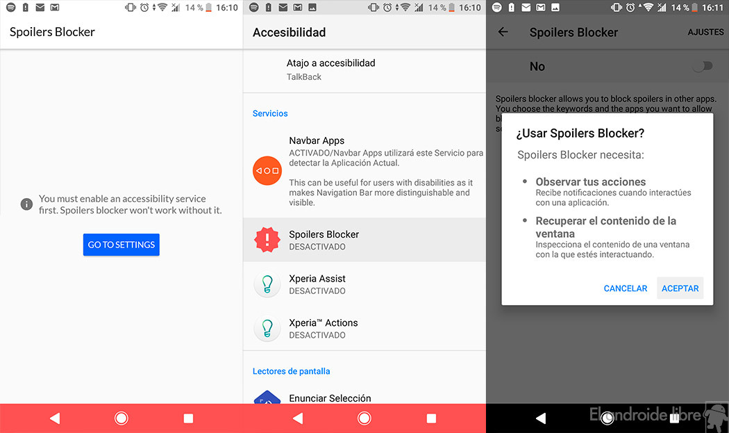 Esta maravillosa app se llama Spoilers Blocker y su cometido como su buen nombre indica consiste en bloquear todo spoiler que veamos tanto en redes sociales como en apps de mensajería. Para ello, antes de nada, deberemos darle acceso a nuestras acciones y darle permisos para inspeccionar el contenido de nuestras ventanas. Tú decides si merece la pena.