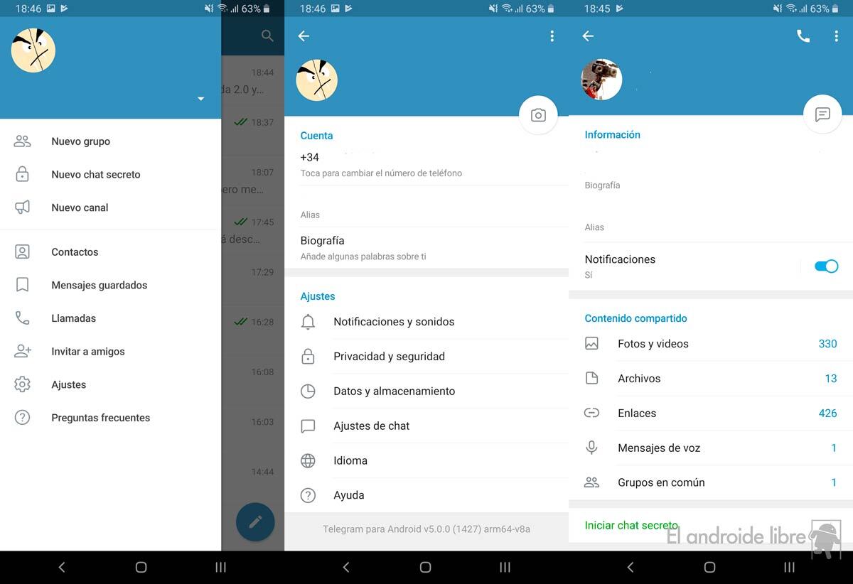 Empezando por el diseño, que es de lo más notorio, Telegram 5 cambia el aspecto de muchos de los iconos aprovechando para ofrecer una interfaz mucho más limpia y minimalista. Esto puede verse en los perfiles o en los ajustes de aplicación, por ejemplo. Además, cada perfil ofrece acceso al contenido que ha compartido, por lo que resulta mucho más sencillo encontrar una foto o un archivo, por ejemplo.