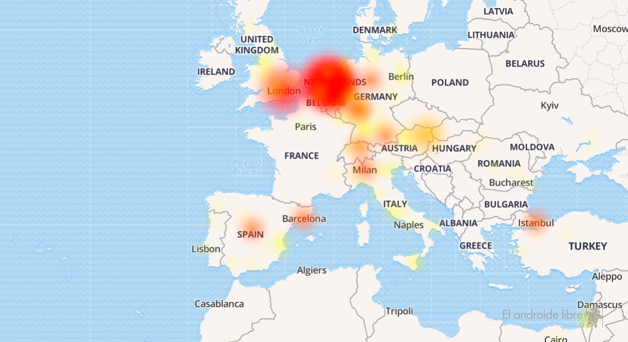 Como suele ser normal, el mayor número de incidencias se está teniendo en las grandes ciudades, que es donde más usuarios hay. En España vemos en el mapa que Barcelona y Madrid son los sitios donde mayor número de caídas se ven.