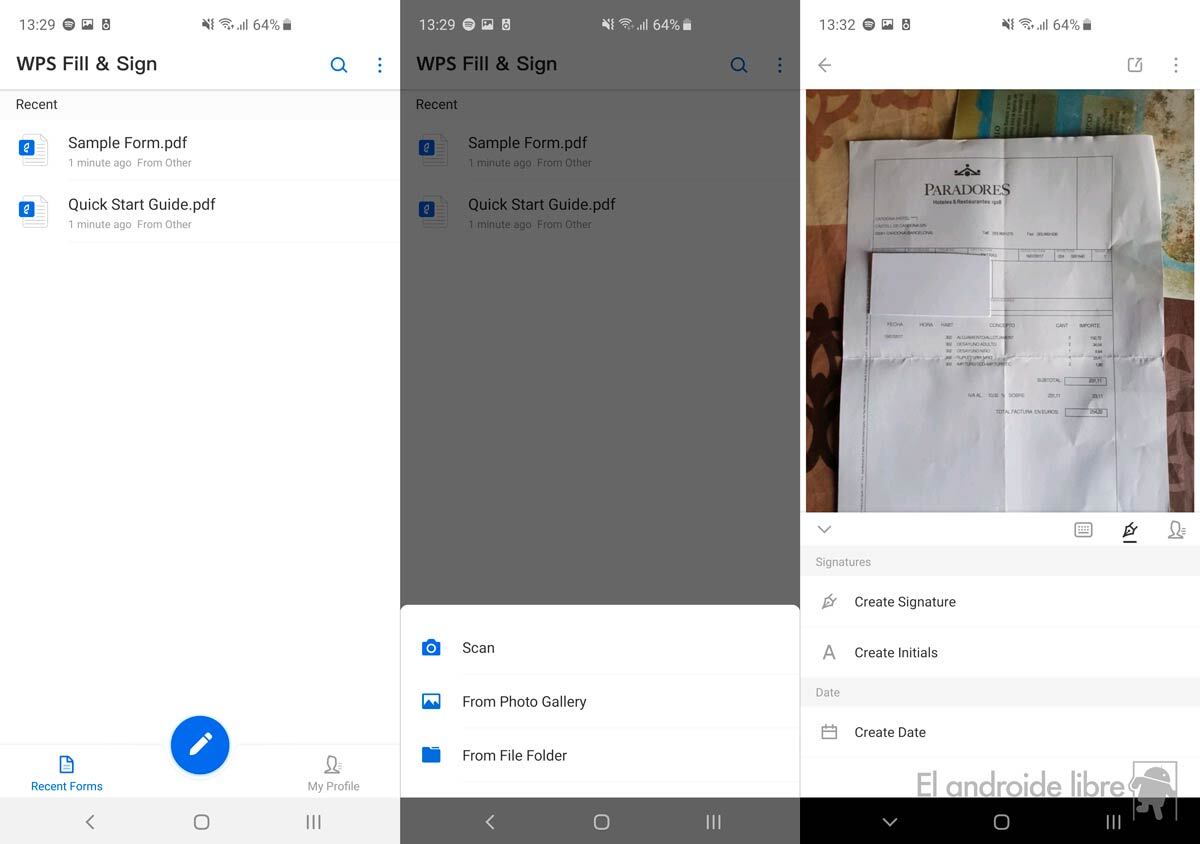 WPS Fill & Sign no tiene misterio alguno: dispone de un listado con los documentos recientes, una zona de perfil para rellenar los datos y así plasmarlos automáticamente en el documento y un botón central de edición con el que aplicar las firmas. Y ya: puedes añadir desde imágenes con la cámara a compartirlas desde la galería; además de cargar documentos desde el almacenamiento (solo PDFs).