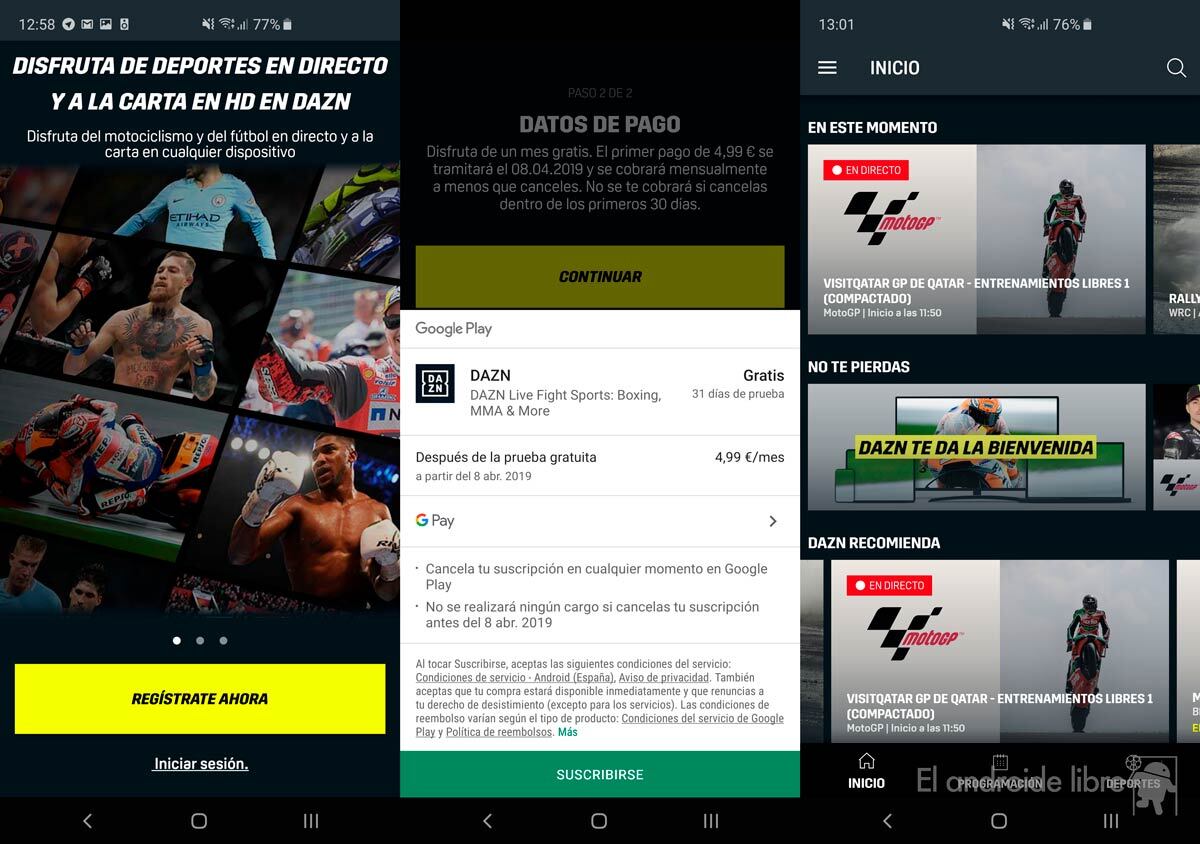 Puedes descargar la aplicación de DAZN desde el siguiente enlace a la Play Store. El primer mes es gratuito, el resto a 4,99 euros mensuales. Un punto positivo es que puedes suscribirte directamente desde la aplicación y a través de la Google Play; teniendo el control de la suscripción desde la propia tienda de apps Android.