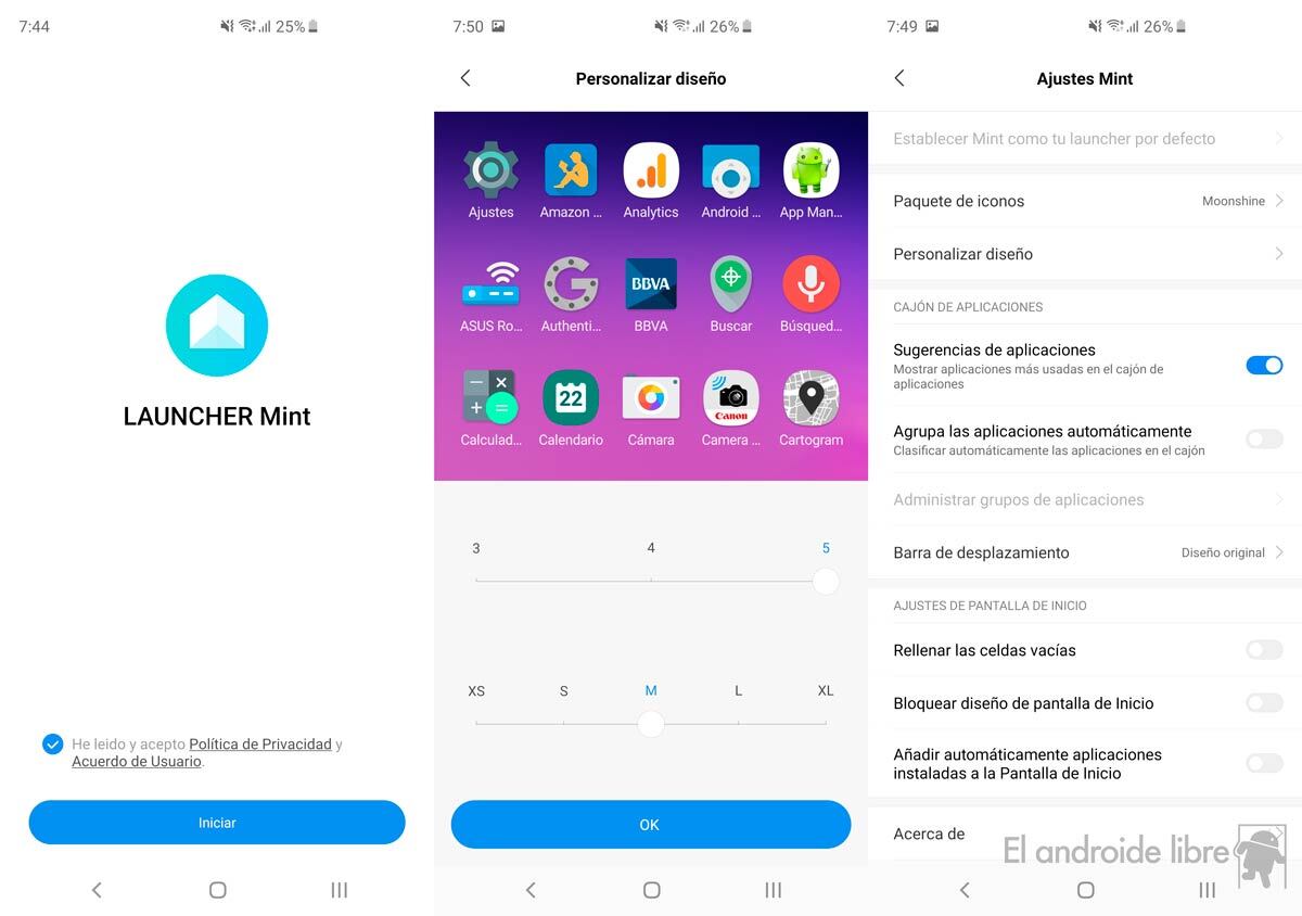 Hemos instalado el Apk del launcher Mint en un Samsung Galaxy S10 y funciona sin ningún tipo de problemas. Es rápido, muy minimalista, dispone de cajón de aplicaciones que se abre deslizando desde la parta inferior de la pantalla hacia arriba, incluye compatibilidad con packs de iconos, permite la personalización del tamaño de dichos iconos y de la rejilla de los escritorios, ofrece organización automática por tipo de aplicaciones… Vamos, que no necesitas nada más para organizar tu smartphone.
