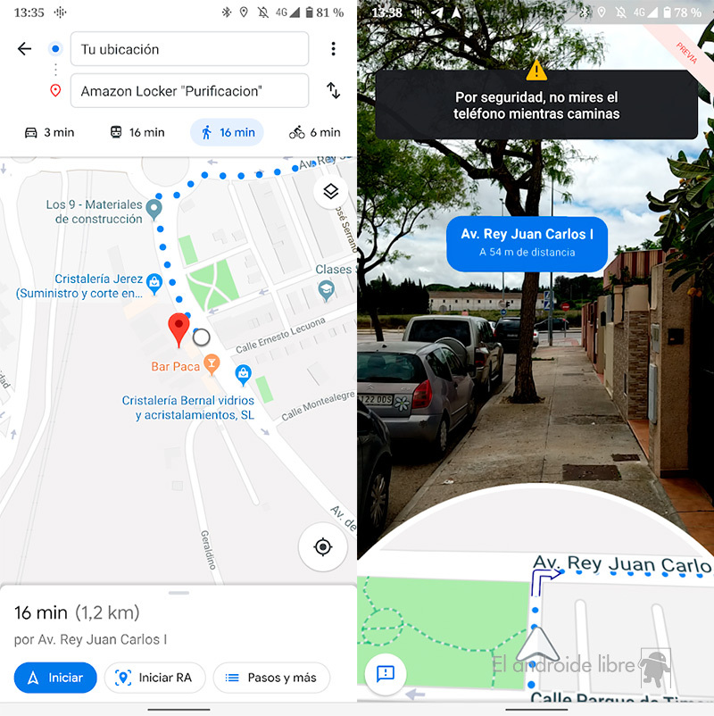 Si bajamos el móvil la interfaz volverá a la normal porque el sistema entiende que no estamos mirando a través de la cámara. Además, si llegamos a una calle o un paso de cebra la app nos mostrará un aviso para que miremos al frente, como medida de seguridad.