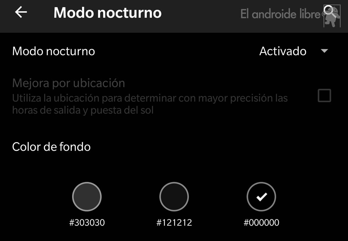 Para elegir cualquiera de los tres fondos solo tienes que acudir a los ajustes de Nova e ir directamente a la opción rotulada como «Modo oscuro«. Elige cualquiera de las tres tonalidades de fondo y también si quieres forzar el oscurecimiento de distintas secciones del launcher; además de optar por la activación automática o personalizar las horas de dicha activación.