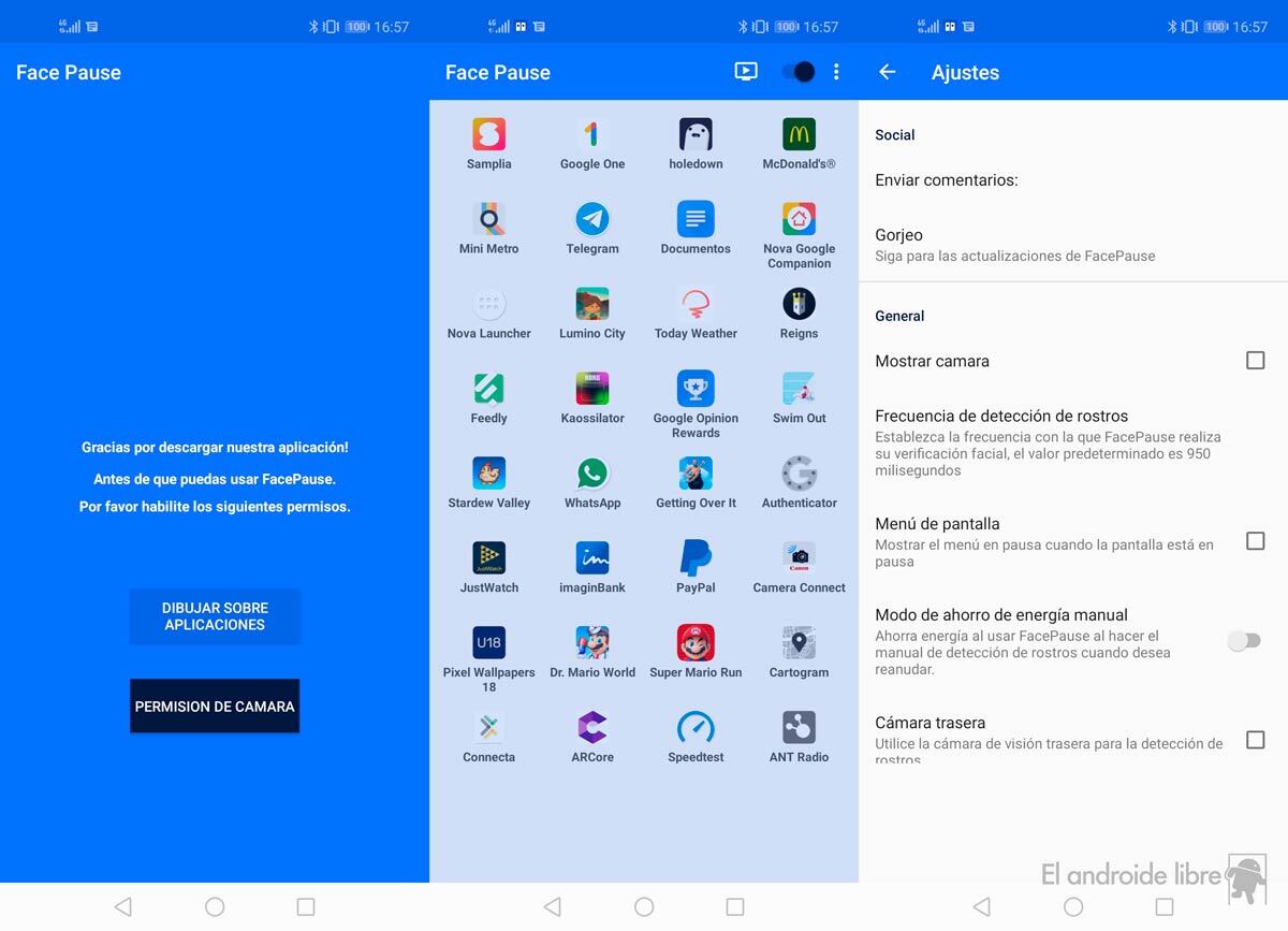 Lo mejor de la app es que resulta tan útil como eficaz: basta con instalarla, darle permiso a la superposición y a la cámara (imprescindibles para que funcione), pulsar en el icono superior de activación y ya la tendremos funcionando. Es compatible con la mayoría de aplicaciones instaladas: reproductor de vídeo, juegos, galería de imágenes, aplicaciones… Y reanuda la visualización una vez detecta de nuevo el rostro.