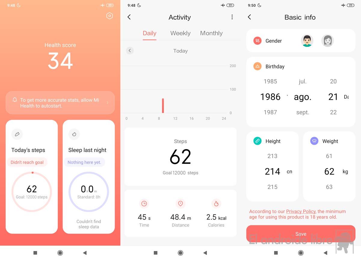 Mi Health utiliza los sensores del teléfono para calcular los pasos, calorías, distancia recorrida y otros indicadores de salud. Es muy similar a Google Fit por ejemplo. O a Xiaomi Mi Fit, pero sin necesitar un accesorio compatible: todo lo necesario se encuentra ya en el teléfono.