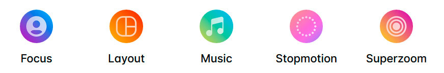 Como veis, tenemos gradientes de color para cada función y aparece una nueva, la plantilla, que permite poner varias fotos a la vez en la misma historia.