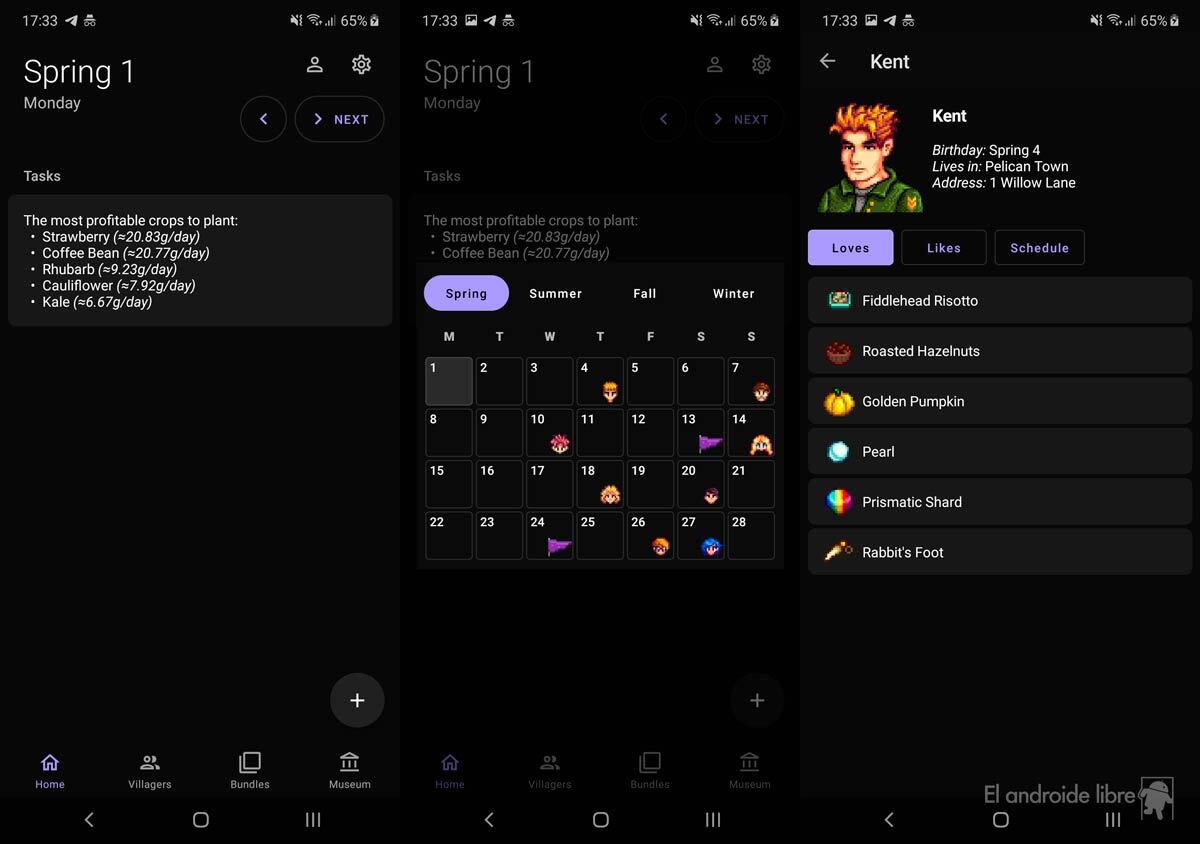 La app está distribuida en cuatro pestañas para así centrarse en distintas categorías de organización. Con la agenda (Home) tendrás una forma de recordar todas las tareas que hay pendientes, también sabrás cuál es la época mejor para cosechar y cuándo debes felicitar a los lugareños; en la pestaña de los habitantes (Villagers) podrás conocer todo sobre ellos, incluida su localización dependiendo de la hora del día (muy útil); en la pestaña de combinaciones (Bundles) tienes acceso a todos los recursos de los que cuenta Stardew Valley para crear los distintos elementos de juego; y en el museo (Museum) puedes marcar todo lo que ya hayas completado para así saber lo que queda pendiente.