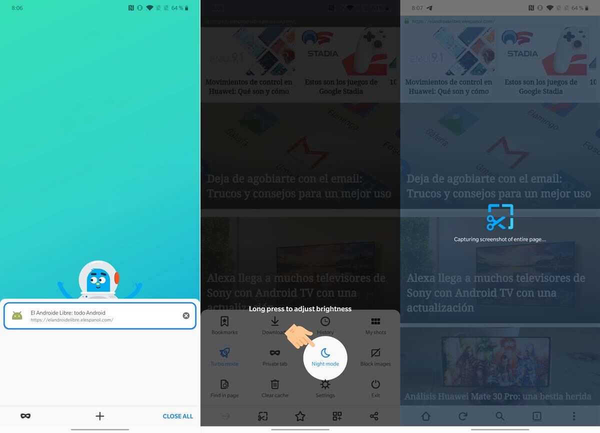 No es que Firefox Lite ofrezca toneladas de funciones, tampoco le hace falta: su finalidad es hacer la experiencia lo más rápida y segura posible. Algo similar a lo que aspira Firefox Focus, pero con un motor de renderizado distinto. Y sin perder opciones tan valiosas como la captura de pantalla de una página web completa, una novedad de la versión 2.0; o el modo noche (que no oscuro).