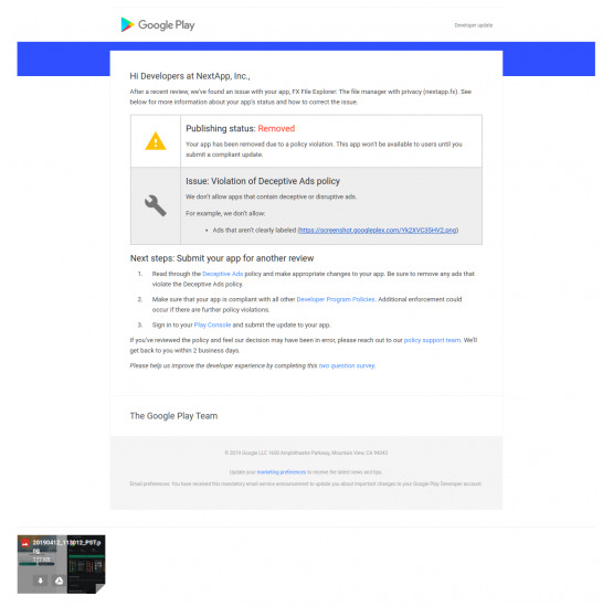 «FX fue eliminada de Google Play por la política de «violación de publicidad engañosa». Aparentemente, ofrecer el tema gratuito (y open source) FX Faenza como descarga en Play Store es publicidad engañosa. No lo entiendo, e inmediatamente he apelado. Mirad las capturas de pantalla». Afirma el desarrollador.