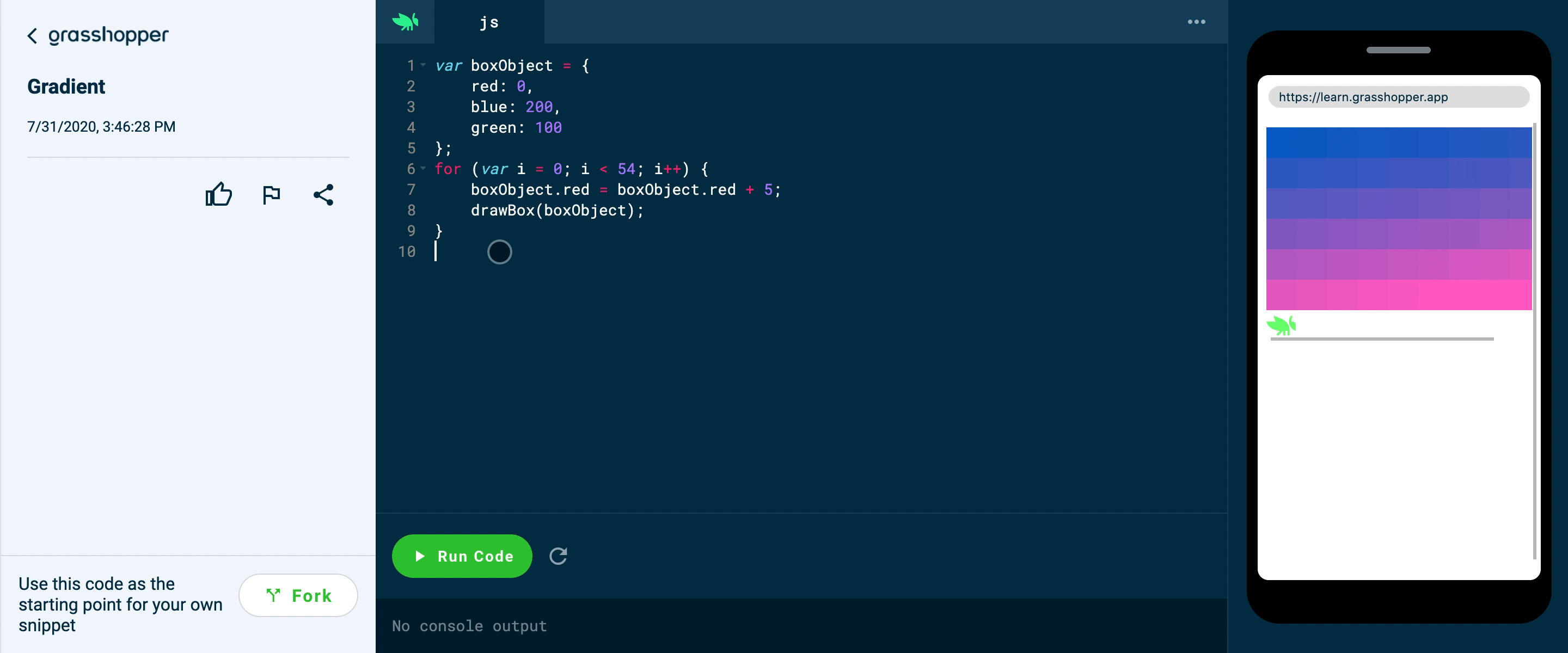 El objetivo principal de Grasshopper Gallery es que los estudiantes vayan a poder aplicar en la vida real sus conocimientos de codificación. Nos encontramos con una serie de ejercicios donde se podrán aprender conceptos clave de codificación como funciones, bucles y variables. Gracias a estos ejercicios, los estudiantes desarrollan habilidades de codificación y van a poder ganar confianza en sus habilidades a medida que avanzan en el plan de estudios diseñado en la aplicación.