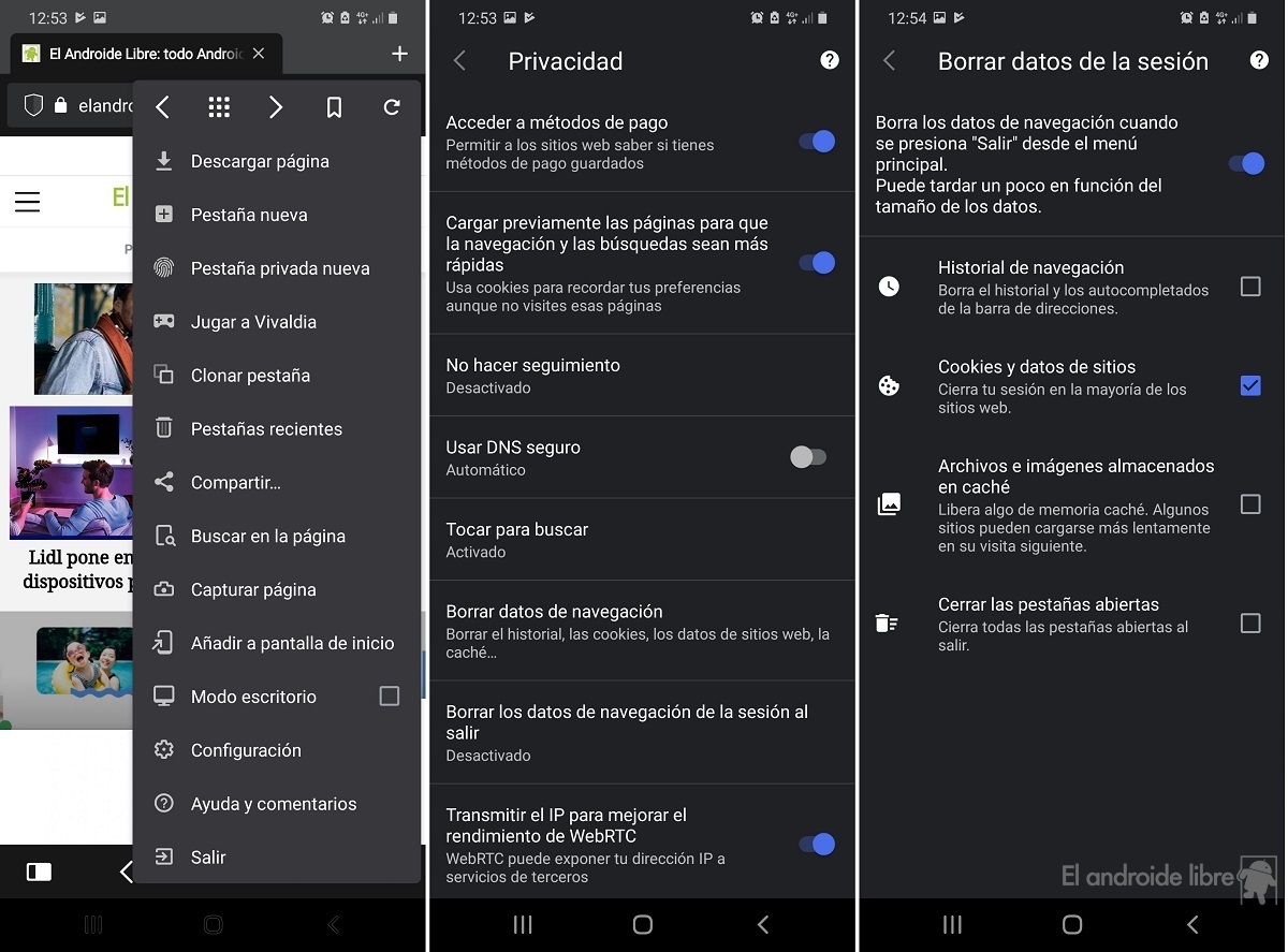 En esta nueva versión 3.5 de Vivaldi para Android se introduce la limpieza de datos completa al salir de la aplicación. Los usuarios podrán seleccionar esta opción desde los ajustes, de manera que el navegador va a eliminar todos los registros de navegación, datos y cookies, además de vaciar el caché por completo y también cerrará las pestañas que haya abiertas. Se podrá elegir si se quiere que esto se aplique a todos los elementos o no.