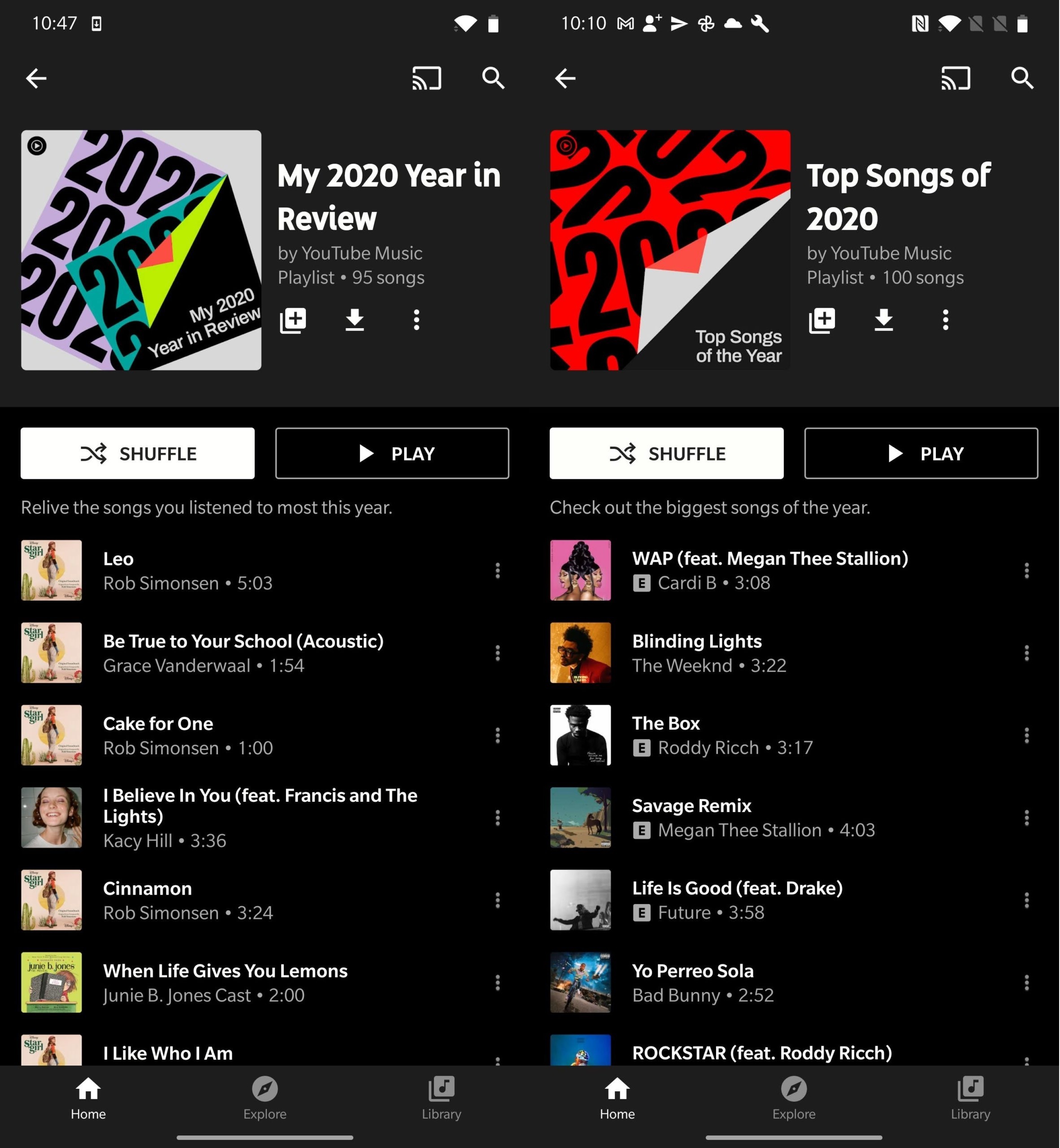 La aplicación propiedad de Google, que ha crecido este año de forma notable, lanza su resumen del 2020. YouTube Music crea una serie de listas de reproducción para los usuarios, con el Top 100 de canciones del año, aunque no dan apenas datos, como cuál es la canción más escuchada.