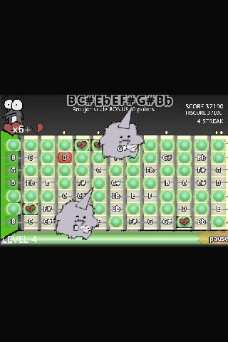 Este juego es sencillo pero muy adictivo. El objetivo es ir arrastrando unos monstruitos que llevan una nota musical a la correspondiente nota en el mástil de una guitarra.