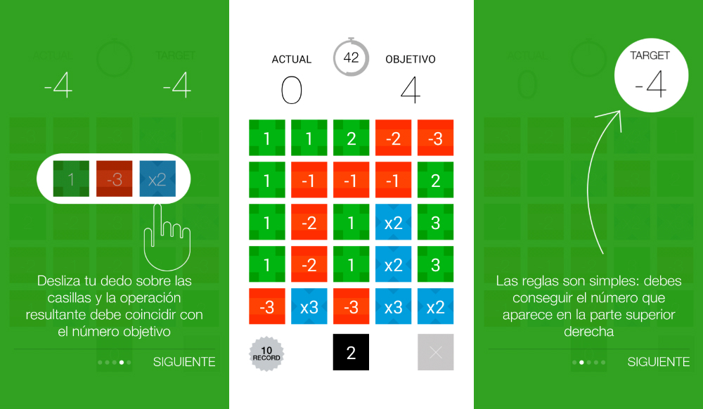 Explicado así puede parecer extraño y difícil de entender, pero una vez lees el minitutorial de inicio y juegas alguna partida, queda claro del todo. De momento tenemos dos modos de juego: uno normal en el que tenemos que resolver el máximo de números posibles en 90 segundos y otro contrarreloj en el que iremos sumando tiempo con cada objetivo conseguido.