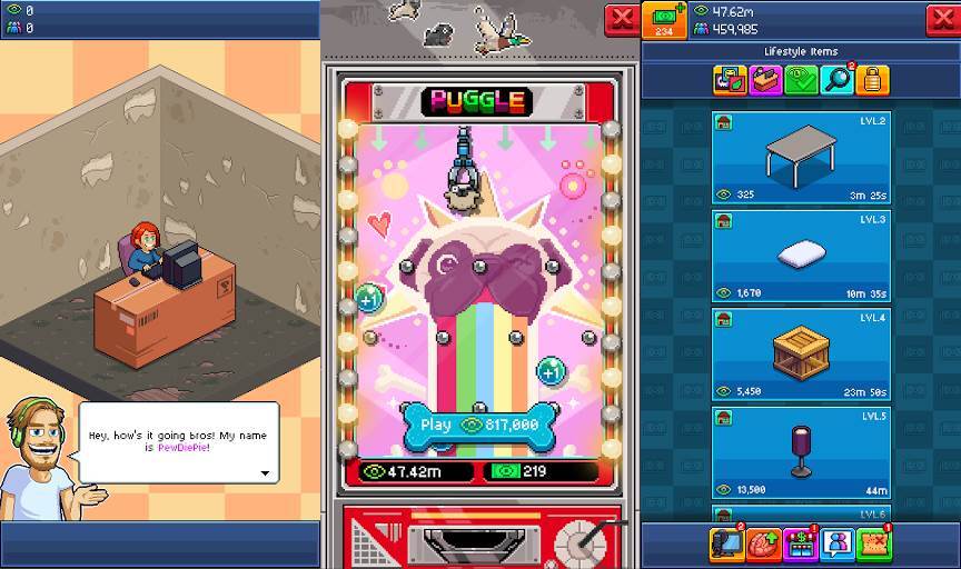 El juego básicamente es un simulador de YouTuber. Empezamos con una simple mesa y un ordenador en el que tendremos que hacer videos para convertirnos en una estrella. Conforme vayamos consiguiendo más fondos, podremos decorar nuestra habitación a nuestro estilo, la cual nos permitirá seguir progresando en nuestra búsqueda del éxito.